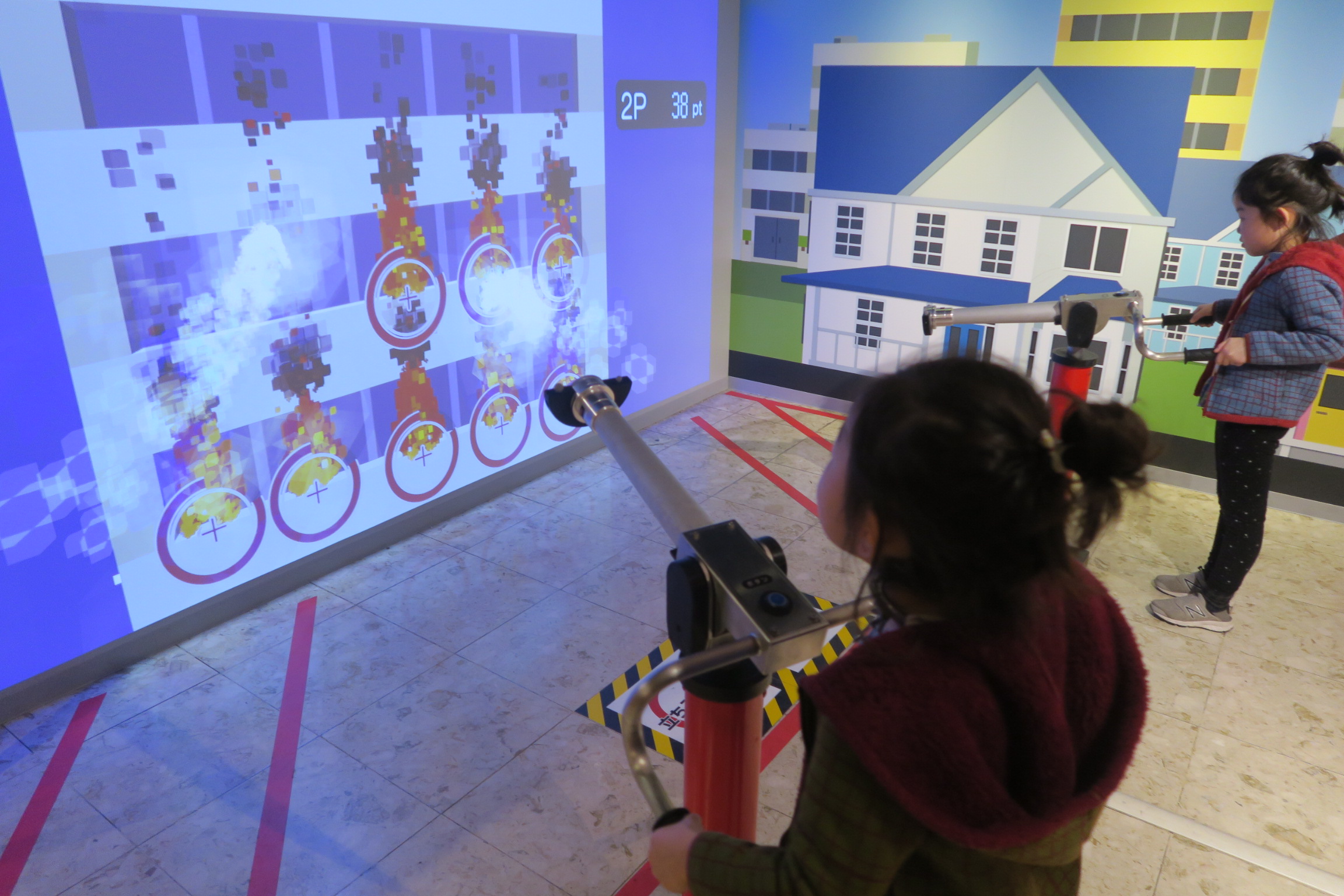 キッザニアでの実際の放水体験もすごいけど、こちらはバーチャルで消防車を運転し、ゲーム形式で消火活動を体験します。